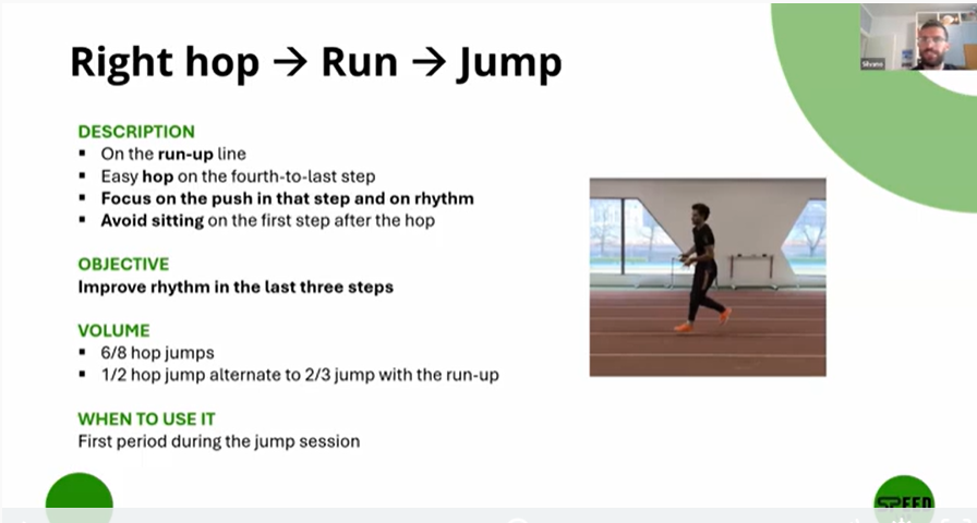 The goal here is to improve the rhythm of the last three steps and create a faster, more organized acceleration into take-off. The hop itself is not meant to be powerful or exaggerated. In fact, one of the key coaching points is that it should remain easy. The real focus comes immediately after: the athlete must avoid “sitting” on the first step after the hop and instead start running fast into the curve. That first step is crucial, because it begins to organize the lean and the final rhythm before take-off.