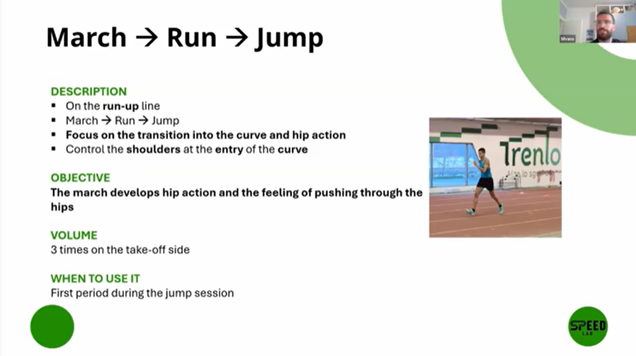 Silvano uses this drill mainly in the first phase of preparation, generally during jump sessions, often for 3 repetitions on the take-off side.