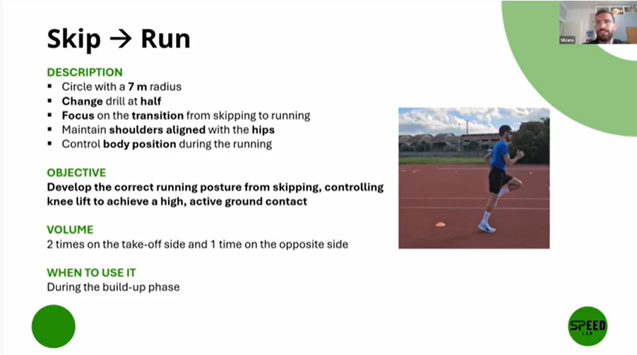 The main coaching focus is on the transition from skipping to running, because that moment closely reflects the shift from the straight part of the approach into the curve. The athlete is asked to maintain good body control throughout, especially by keeping the shoulders aligned with the hips and controlling posture rather than simply trying to move fast. In fact, the drill is often more effective when performed at a slightly slower speed, because the athlete has a better chance of feeling the correct position.